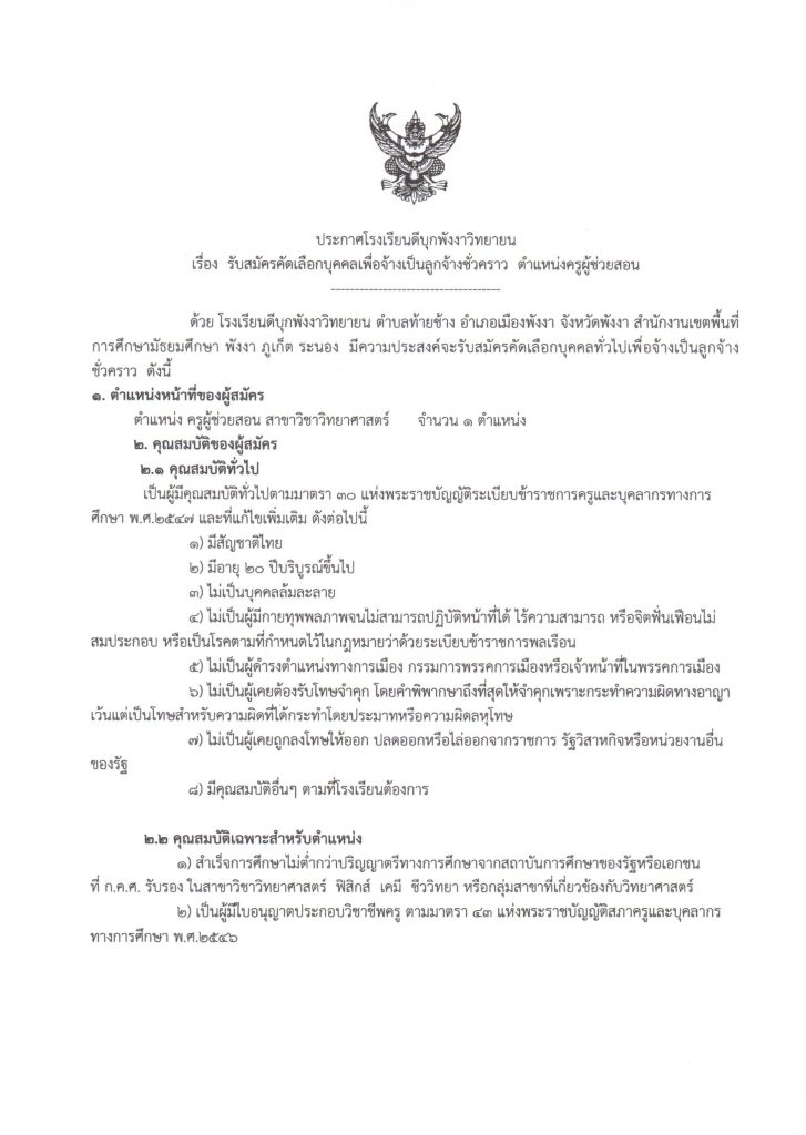 รับสมัครคัดเลือกบุคคลเพื่อจ้างเป็นลูกจ้างชั่วคราว ตำแหน่งครูผู้ช่วยสอน
