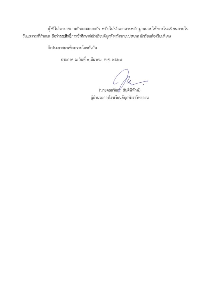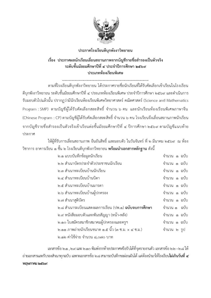 ประกาศผลนักเรียนเลื่อนสภาพจากบัญชีรายชื่อสำรองเป็นตัวจริง ระดับชั้นมัธยมศึกษาปีที่ 4 ประจำปีการศึกษา 2569 ประเภทห้องเรียนพิเศษ 01/03/2026 ข่าวประชาสัมพันธ์