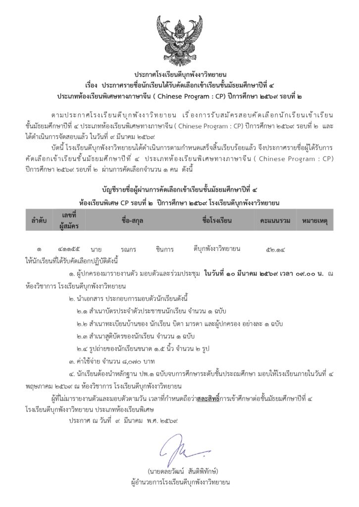 ประกาศรายชื่อนักเรียนได้รับคัดเลือกเข้าเรียนชั้นมัธยมศึกษาปีที่ 4 ประเภทห้องเรียนพิเศษทางภาษาจีน (Chinese Program : CP) ปีการศึกษา 2569 รอบที่ 2 09/03/2026 ข่าวประชาสัมพันธ์