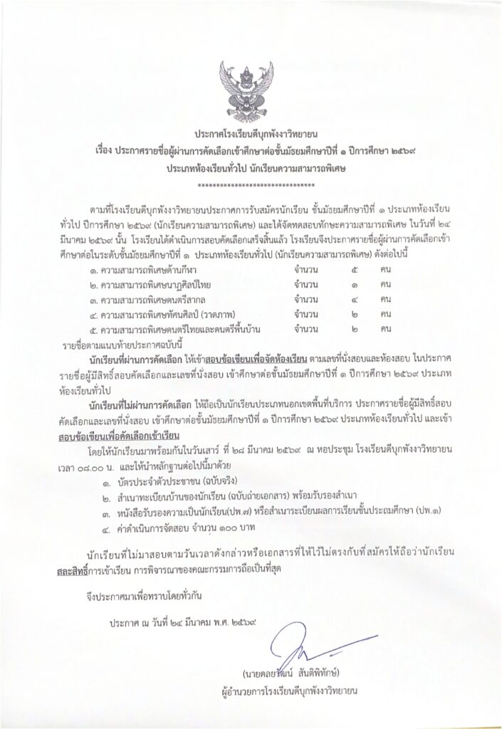 ประกาศรายชื่อผู้ผ่านการคัดเลือกเข้าศึกษาต่อชั้นมัธยมศึกษาปีที่ 1 ปีการศึกษา 2569 ประเภทห้องเรียนทั่วไป นักเรียนความสามารถพิเศษ 24/03/2026 ข่าวประชาสัมพันธ์