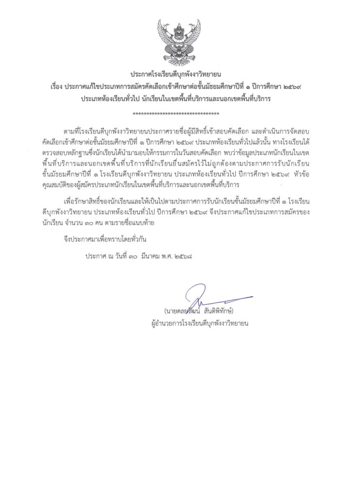 ประกาศแก้ไขประเภทการสมัครคัดเลือกเข้าศึกษาต่อชั้นมัธยมศึกษาปีที่ 1 ปีการศึกษา 2569 ประเภทห้องเรียนทั่วไป นักเรียนในเขตพื้นที่บริการและนอกเขตพื้นที่บริการ 30/03/2026 ข่าวประชาสัมพันธ์ <<ดาวน์โหลดประกาศ>>