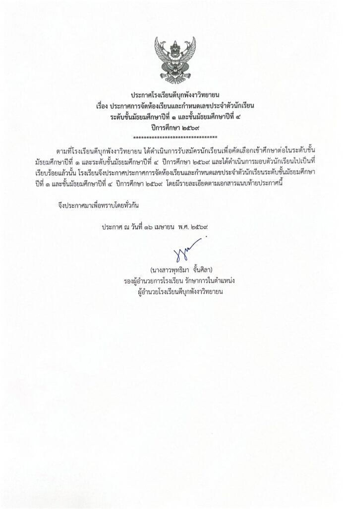 ประกาศการจัดห้องเรียนและกำหนดเลขประจำตัวนักเรียน ระดับชั้นมัธยมศึกษาปีที่ 1 และชั้นมัธยมศึกษาปีที่ 4 ปีการศึกษา 2569 16/04/2026 ข่าวประชาสัมพันธ์ << รายชื่อนักเรียนชั้น ม.1 >> << รายชื่อนักเรียนชั้น ม.4 >>